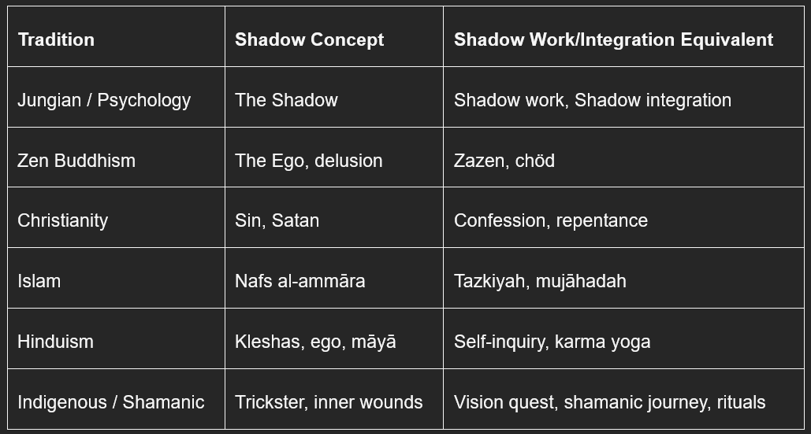Here is a table, highlighting the various names that the practice of shadow work and the goal of shadow integration has in various known religions